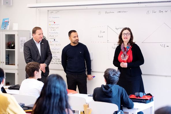Statsministern träffade förväntansfulla elever Under besöket på Storvretskolan fick statsministern och utbildningsministern möjlighet att träffa några av de förväntansfulla eleverna. Först blev det ett besök på mattelektionen hos årskurs nio, följt av ett samtal i biblioteket där elever ställde sina egna frågor till ministrarna. Frågorna och samtalen handlade om allt från coronarestriktionerna till frågor om brott och straff.