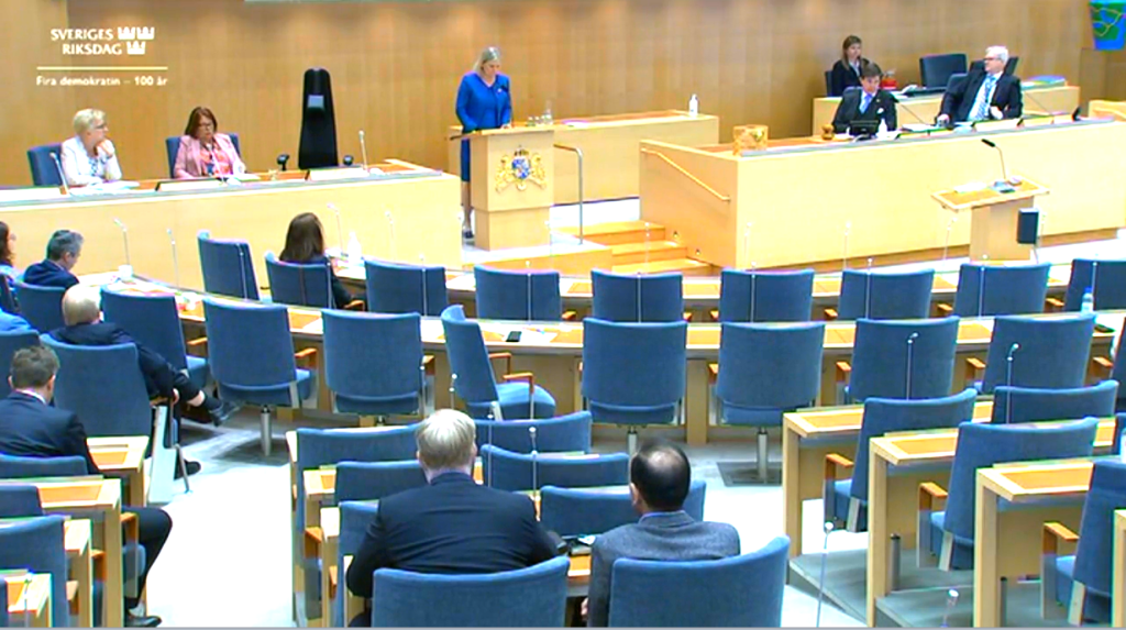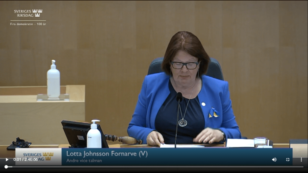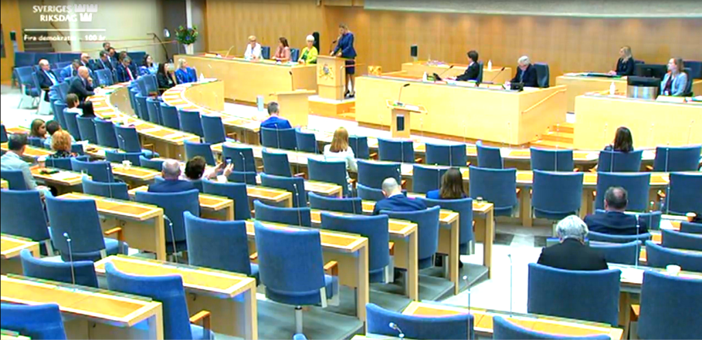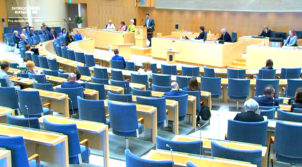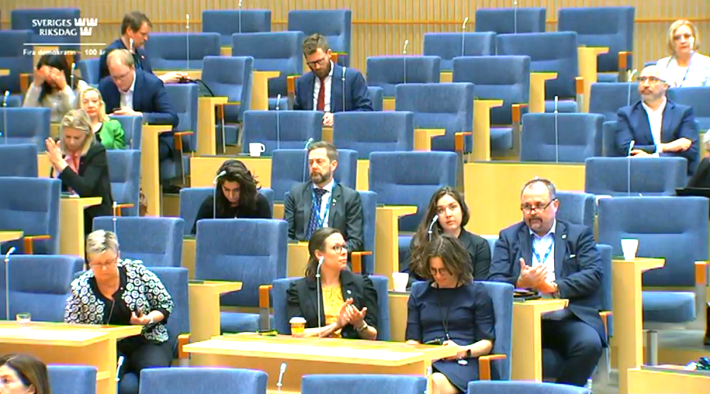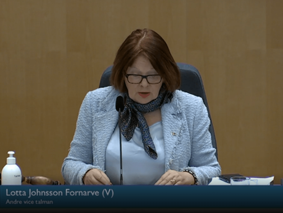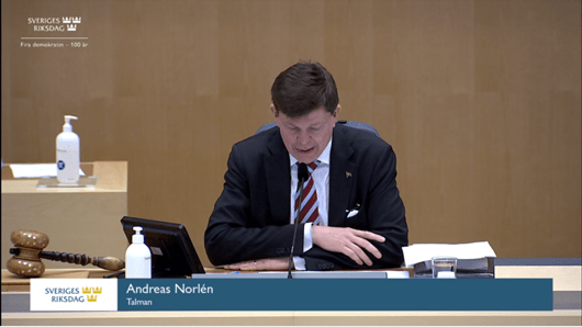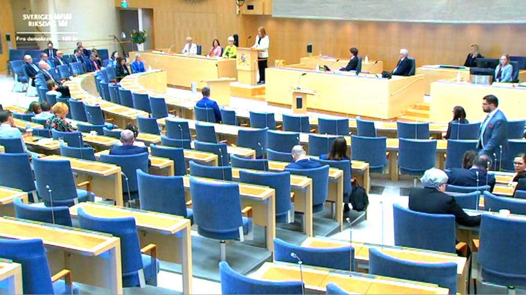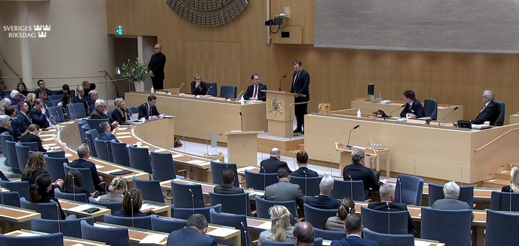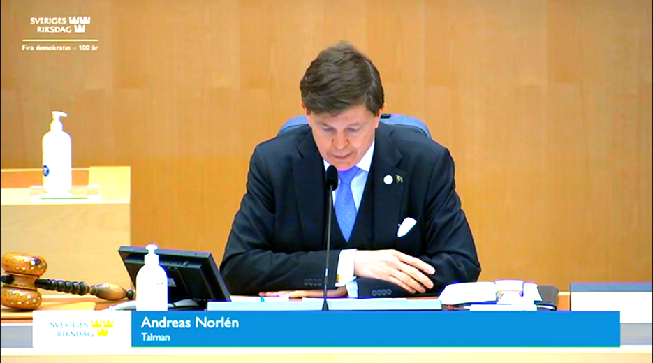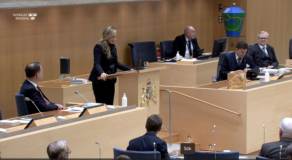 – Innan vi inleder dagens partiledardebatt vill jag särskilt uppmärksamma kammaren på att debatten gästas av parlamentariker från Nordmakedonien. Detta arbetsbesök sker inom ramen för riksdagens bilaterala demokratifrämjande samarbete med Nordmakedoniens parlament, som har pågått sedan 2020. Vi hälsar våra gäster varmt välkomna.