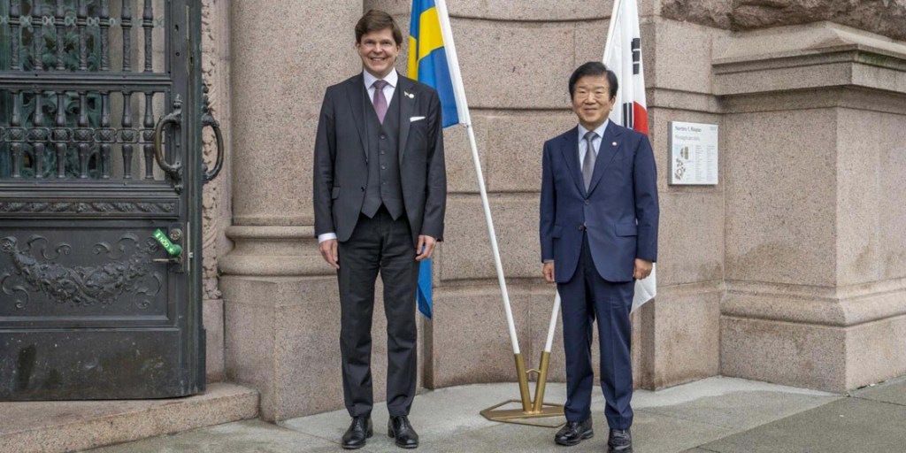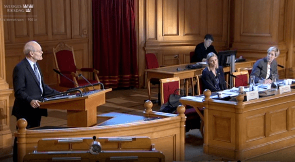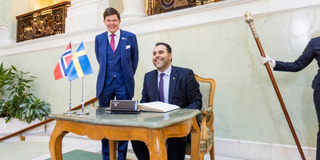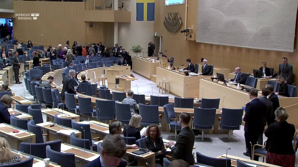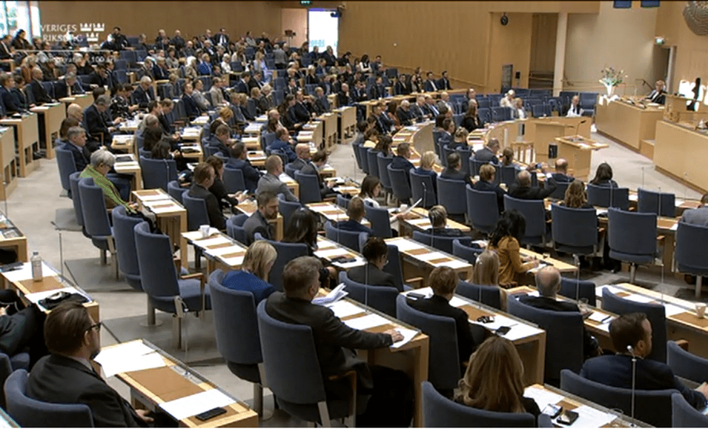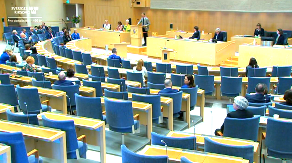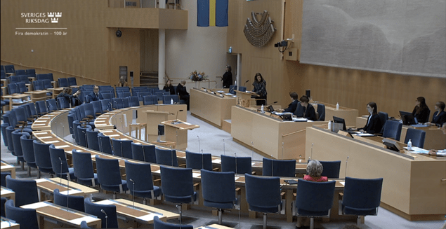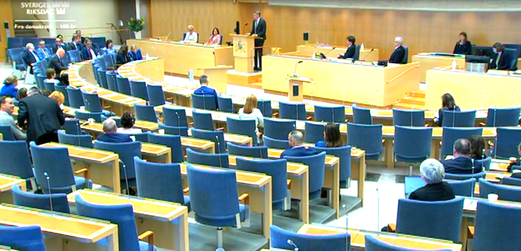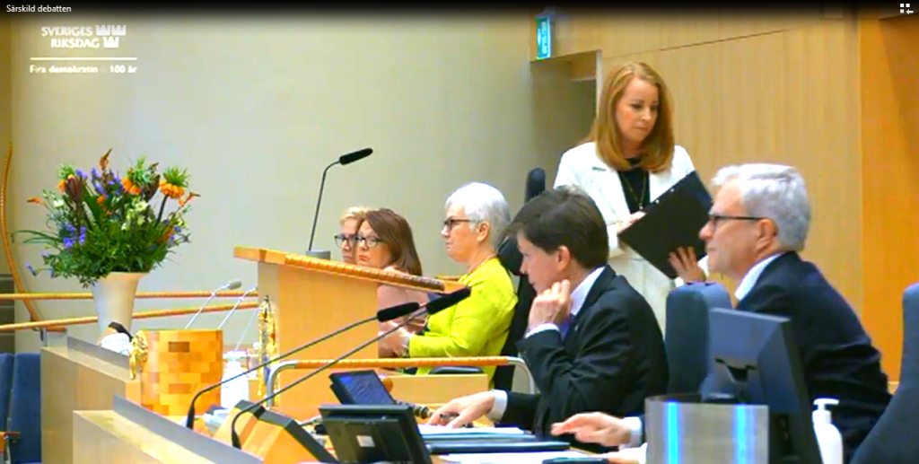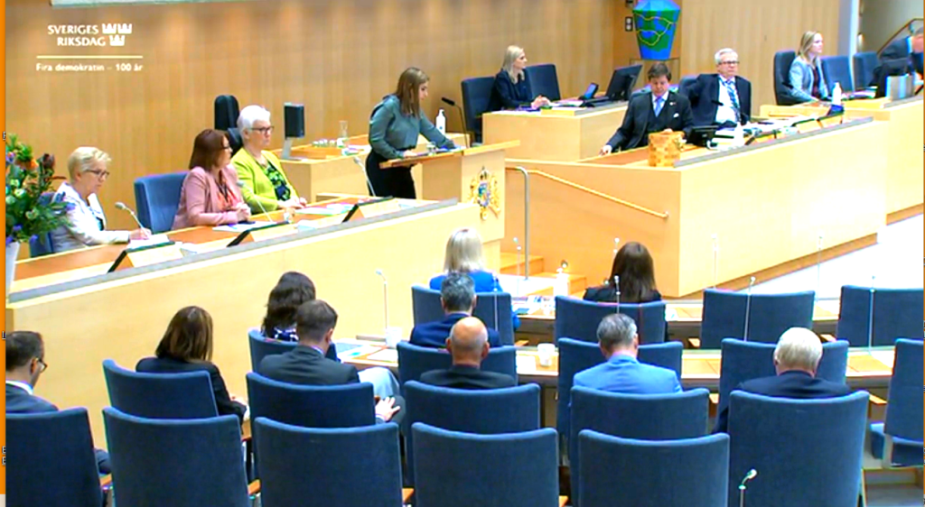 – Innan vi inleder dagens partiledardebatt vill jag särskilt uppmärksamma kammaren på att debatten gästas av parlamentariker från Nordmakedonien. Detta arbetsbesök sker inom ramen för riksdagens bilaterala demokratifrämjande samarbete med Nordmakedoniens parlament, som har pågått sedan 2020. Vi hälsar våra gäster varmt välkomna.