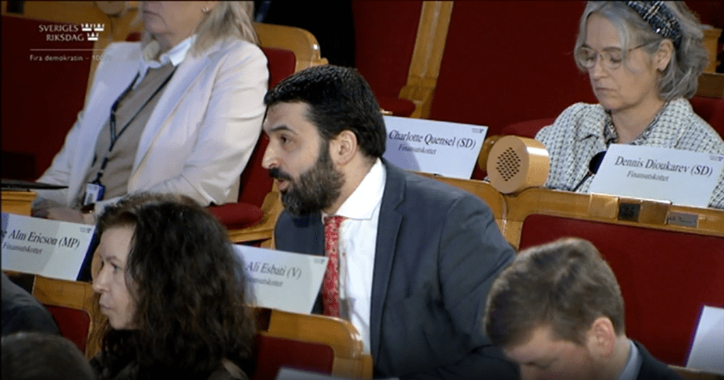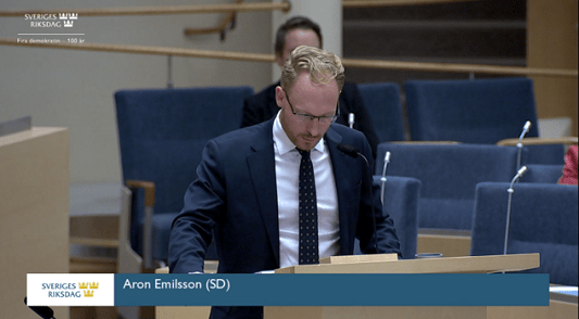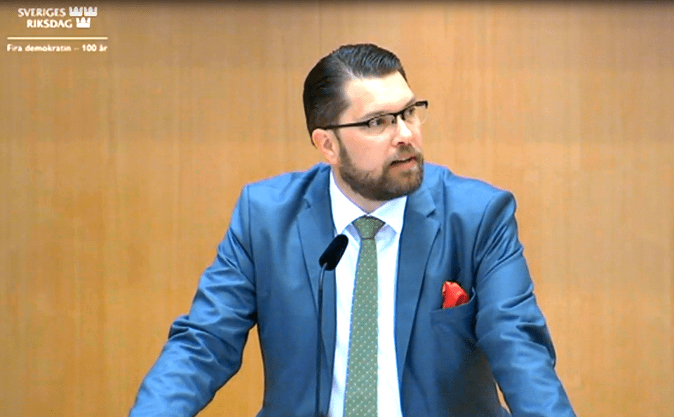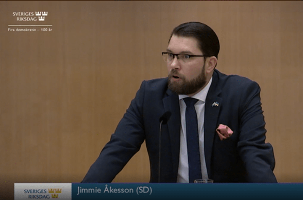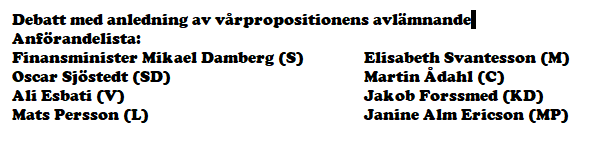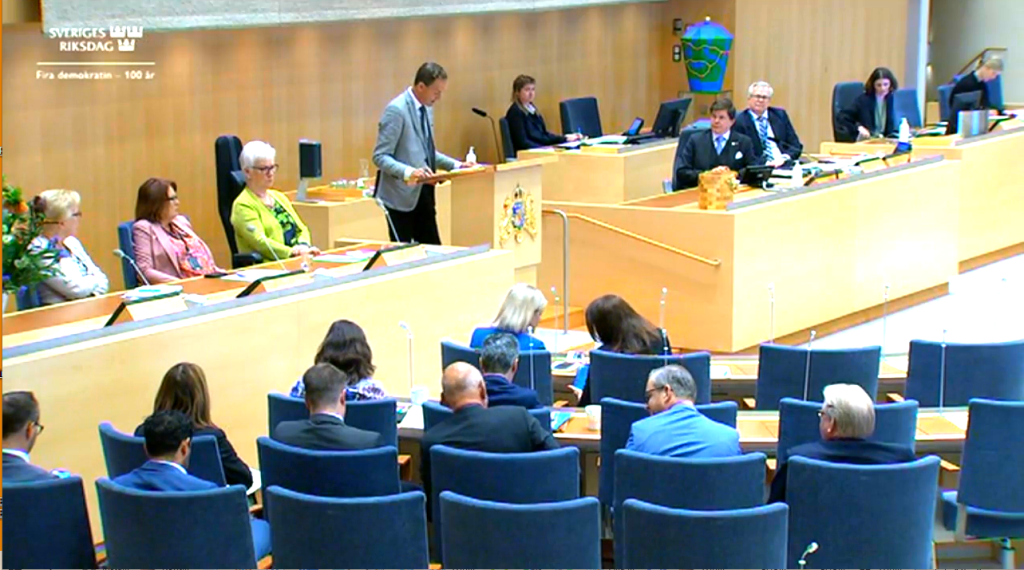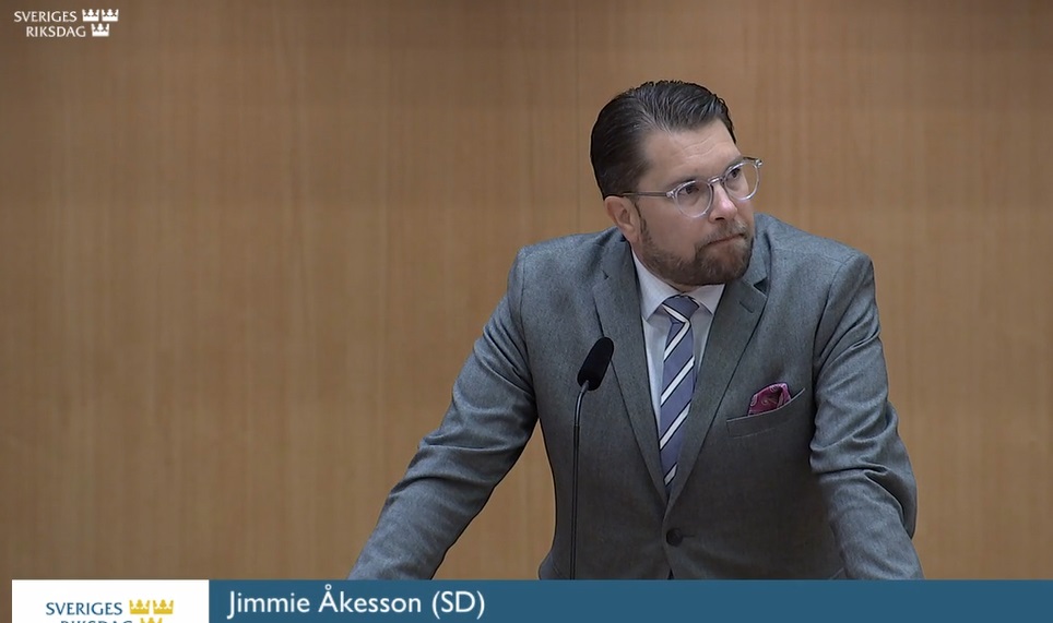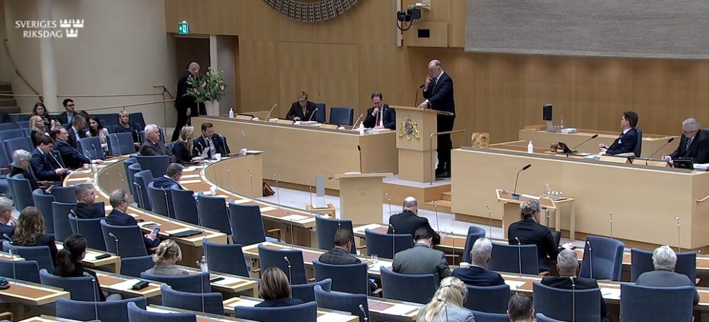 – Herr talman! Vi minskar invandringen till Sverige. Vi har redan skärpt kraven för anhöriginvandring, stramat åt reglerna för uppehållstillstånd och minskat antalet kvotflyktingar. I januari fick polisen nya verktyg för att också bekämpa skuggsamhället.