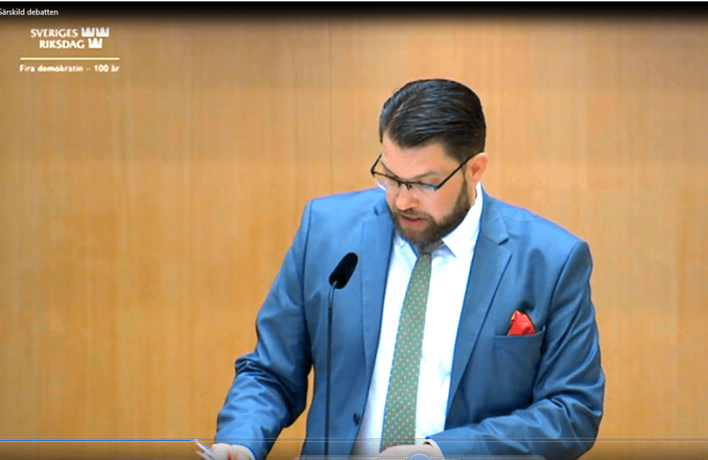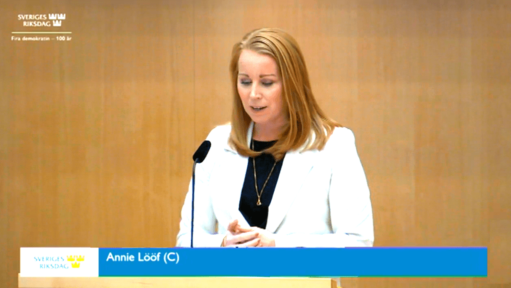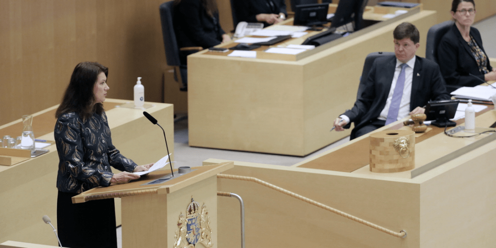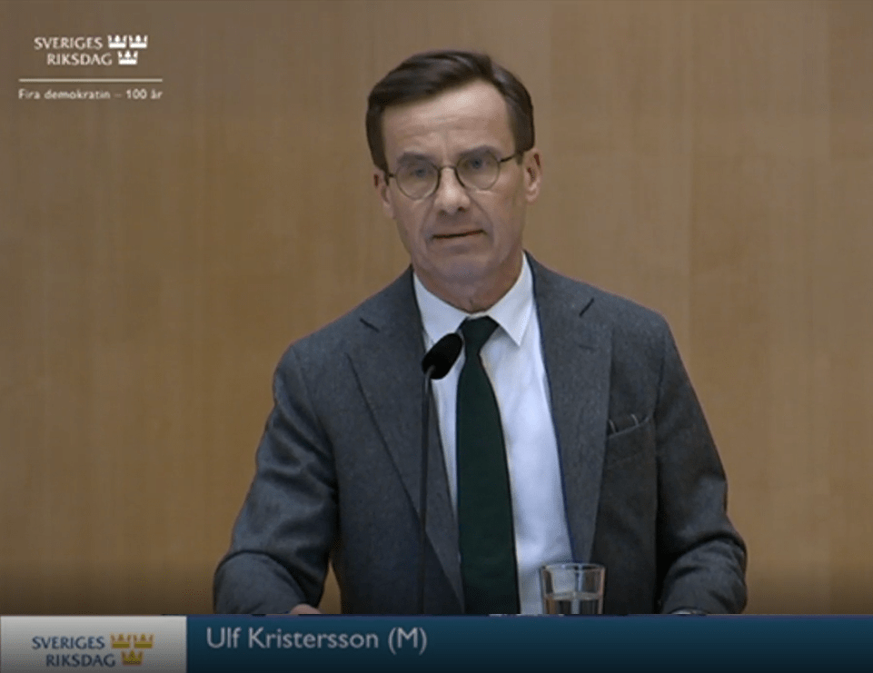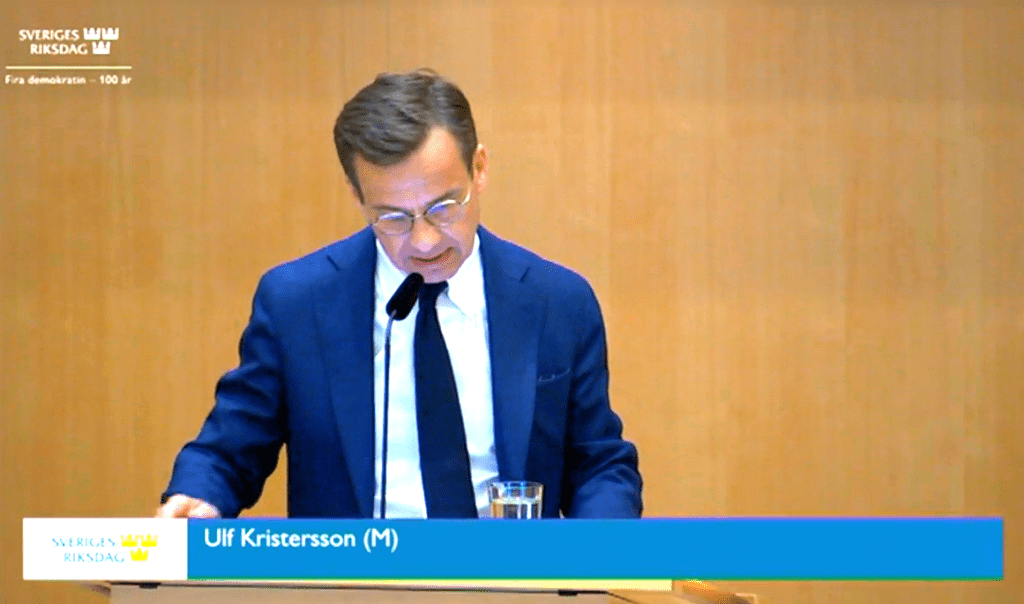 – Herr talman! Sverige är i grunden ett starkt land. Svenska folket har mött osäkra tider förr, och vi har tagit oss igenom ekonomiska kriser och pandemier och slagit tillbaka mot otrygghet och krafter som vill splittra vårt land. Vi har gjort detta genom sammanhållning och genom att möta det som utmanar oss, oavsett om det är en kraschad arbetsmarknad, virus eller terrorister, som ett land, som ett samhälle, som en nation. Detta kräver ett tydligt och rakryggat ledarskap från politiken och handling och förmåga att prioritera det viktiga: att politiken inriktas på det som är bäst för Sverige och för svenska folket.