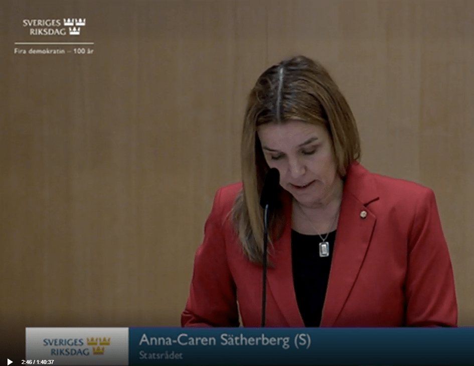 – Herr talman! Det kommer att krävas hårt arbete för att få ordning på Sverige. Det är därför vi har ett högt tempo i den här regeringen. Risken är inte att regeringen går för långt eller gör för mycket. Risken i Sverige är nästan alltid att det tar för lång tid. Därför behövs nu både otålighet och uthållighet, precis som den här regeringen har.