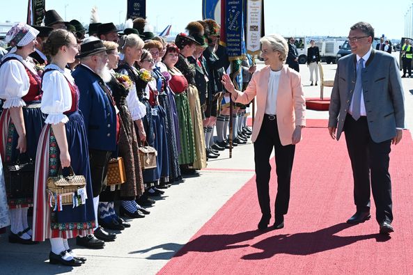 Enligt TT välkomnades Presidentparet på förmiddagen med en ceremoni där kung Carl Gustaf och drottning Silvia deltog.