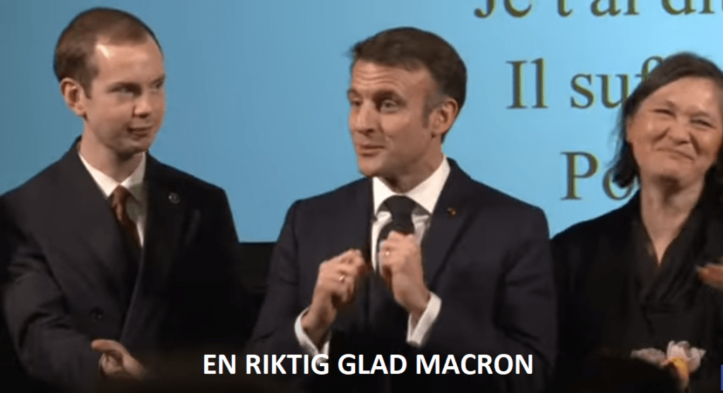 Uppenbarligen stortrivdes President Emmanuel Macron med sitt statsbesök till Sverige. Man säger att en bild talar tusen ord. Enligt AFP även sjöng President Emmanuel Macron “Les Champs-Elysées” under sitt besök till Lunds Universitet.