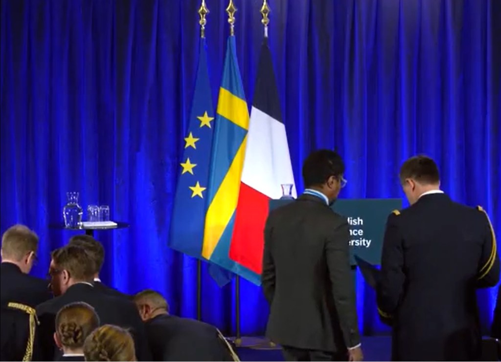 President Emmanuel Macron besökte Försvarshögskolan på Karlbergs slott med Kungen och statsminister Ulf Kristersson. Där hade de ett rundabordssamtal om framtiden för europeisk säkerhet. Samt deltog säkerhetspolitiska experter från Sverige och Frankrike med bland andra Utrikespolitiska institutets direktör Jakob Hallgren och Försvarshögskolans rektor Robert Egnell som hälsade alla välkomna vid ankomst. Vid rundabordssamtalet deltog även utrikesminister Tobias Billström, försvarsminister Pål Jonson och den nationella säkerhetsrådgivaren Henrik Landerholm. President Macron ett längre anförande inför Försvarshögskolans kadetter och andra särskilt inbjudna. Även Kungen och statsministern talade.