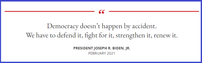 On the International Day of Democracy, President Biden said: “No democracy is perfect, and no democracy is ever final. Every gain made, every barrier broken, is the result of determined, unceasing work.”