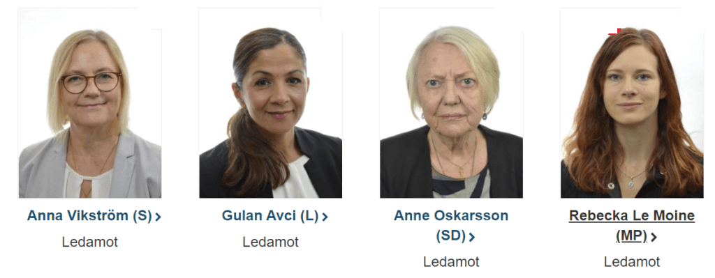 Henrik Vinge (SD) GruppledareAnders W Jonsson (C)GruppledareAnnika Hirvonen (MP) Gruppledare.Maj Karlsson (V) Gruppledare.Andreas Carlsson (KD) Gruppledare.Johan Pehrson (L) Gruppledare