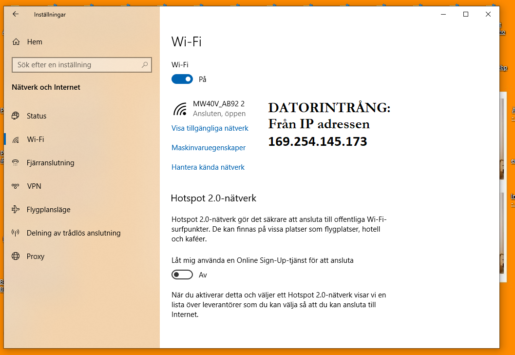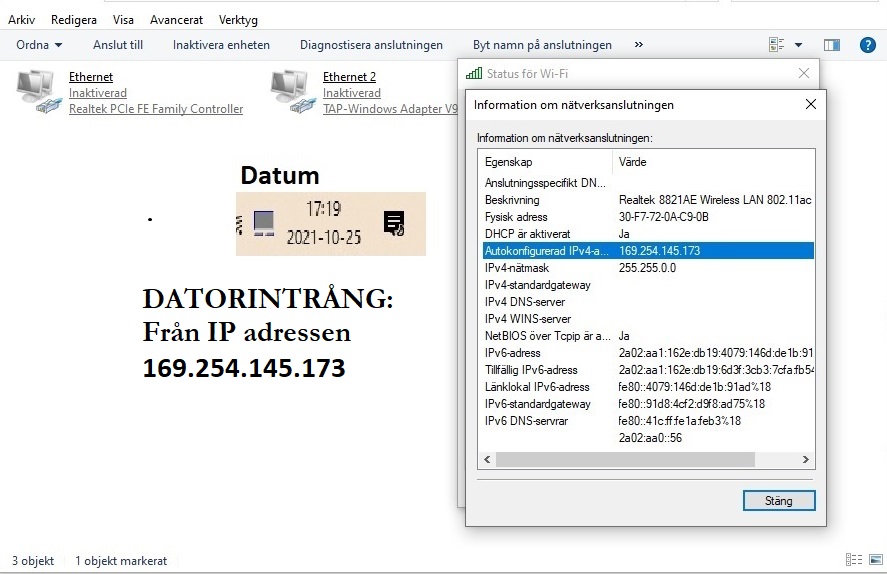 Någon har hackat vår dator och stulit en stor mängd material. Det är någon med dessa IP ADRESSER – IP: 169.254.145.173, IP: 169.254.165.26/16 och IP: 169.254.174.129/16 som har hackat vår dator, tagit sig in och stulit contentmaterial på 100 gigabit. Tack vara nätverksdiagnostik har vi kunna identifiera och se hackarens IP adresser