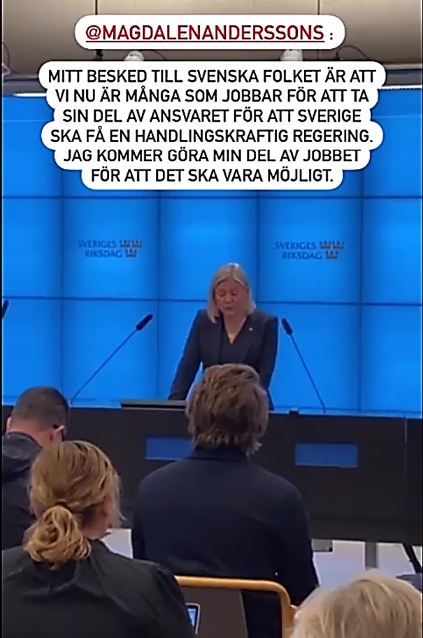 Jag har i dag tagit del av Magdalena Anderssons slutrapport av sonderingsuppdraget hon haft och har därefter till kammaren lagt fram förslaget om Magdalena Andersson som statsminister, sade talman Andreas Norlén vid en pressträff i riksdagen.