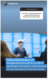Bakgrund Statsminister Stefan Löfven (S) begärde sitt entledigande som statsminister den 10 november och leder nu, enligt reglerna i regeringsformen, en övergångsregering. Talmannen arbetar nu med sitt uppdrag att ta fram ett förslag till ny statsminister för riksdagen att ta ställning till. I uppdraget ingår att samtala med företrädare för samtliga riksdagspartier samt att överlägga med de vice talmännen. Talmannen håller också statschefen informerad om det aktuella läget i arbetet med att ta fram förslag till statsminister.