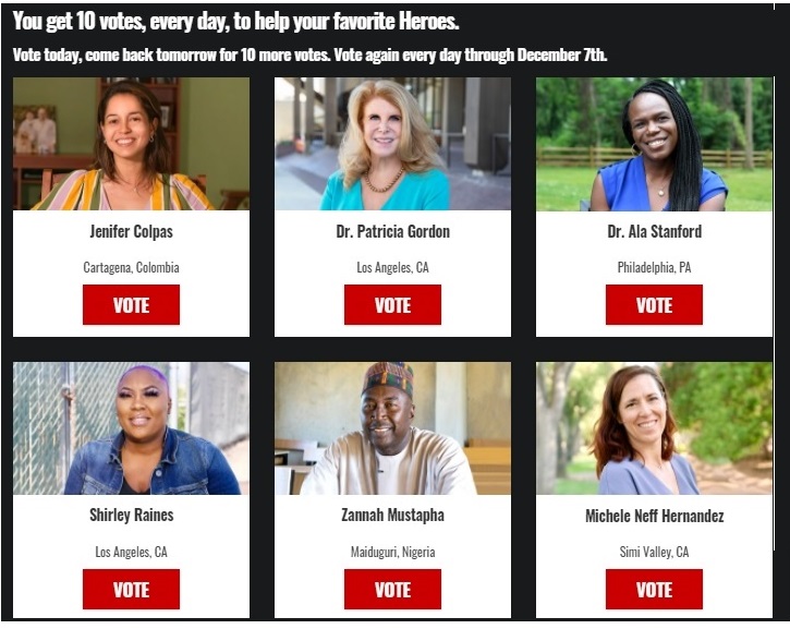 Vote to decide the CNN Hero of the Year 2021! You get 10 votes, every day, to help your favorite Heroes. Vote today, and come back tomorrow for 10 more votes. Vote and again every day through December 7th. Find out who wins live on Sunday, December 12th at 8 pm ET. PS. 10 votes per day. Vote multiple days.